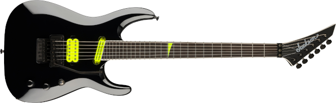 アグレッシブなアーチドトップのSoloist シェイプのアルダーボディに、グラファイト補強ロッドを内蔵した3 ピースメイプルスルーネック。12~16 インチコンパウンドラジアスバウンドエボニー指板はネック全長にわたりコード弾きからソロプレイに対して卓越したプレイアビリティを提供し、27 本のジャンボステンレスフレットと12 フレットのパーロイドシャークフィン、蓄光式Luminlayサイドドットが特徴。ダイレクトマウントのSeymour Duncan Distortion TB-6 ブリッジハムッバッカーとSeymour Duncan Hot Rail SHR-1 ネックピックアップというHS ピックアップ構成は、密度の高いミッドレンジ、スケール感のあるローエンド、ファットなハイエンド、パワーとトーンの見事なバランスを実現。Hot Rail ネックピックアップはピッキングのアタックとダイナミックスを忠実に再現し、高出力でありながらクリアかつディープでウォームなトーンを出力。3 ウェイトグルスイッチ、1 ボリューム、1トーンといったシンプルなコントロールレイアウトにより、求めるサウンドが瞬時に手に入れられる。Floyd Rose 1000 Series ダブルロッキングトレモロは、アグレッシブなアーミングを行なってもチューニングの安定性を堅牢に維持。その他、Jacksonシールドダイキャストチューニングマシン、ロッキングストラップボタンを装備。カラーは、Gloss Black。
