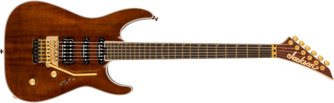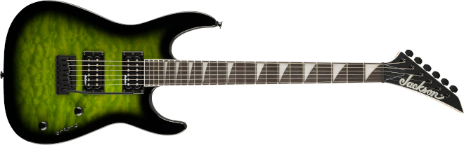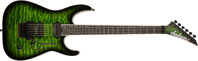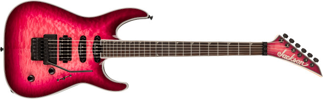 ポプラボディにアーティスティックな木目が際立つキルトメイプルトップをあしらい、グラファイト補強ロッドを内蔵したボルトオン式のメイプルスピードネックを備える。指板には、24 本のジャンボフレット、パーロイドシャークフィンインレイを配した12~16 インチコンパウンドラジアスのバウンドアマランス指板を採用。セラミックマグネットを採用した2 基のJackson高出力ハムバッカーは、3 ウェイブレードスイッチングとシングルボリュームとトーンといったシンプルなコントロールで多彩なサウンドメイキングを実現。2 点支持シンクロナイズドトレモロ、スタンダードストラップボタン、ダイキャストチューニングマシンなどのオールブラックのハードウェアも特徴。カラーは、Transparent Black Burst、Transparent Blue Burst、Transparent Green Burst、Transparent Tobacco Burst の4 色展開。
