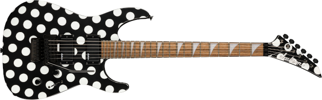 由緒あるダブルカッタウェイの主力モデル。ニヤトーボディに、ネックを安定させるためにグラファイト補強された、ティルトバックスカーフジョイントネックを採用したメイプルスルーネックが特徴。カバー付きのアクティブJackson高出力ハムバッカーは、フルボディトーンのクランチサウンドを提供。2024 年の新色としてブラックJackson先鋭な6 インラインヘッドストックを搭載したPolka Dotが登場。