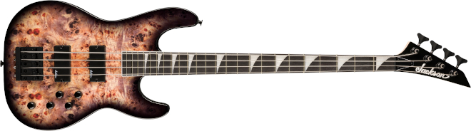 4弦仕様の本製品は、アーティスティックな木目が際立つポプラバールトップをあしらった軽量でレゾナンスに優れた34 インチスケール長ポプラボディに、スカーフジョイントと内蔵グラファイト補強ロッドによって強化されたボルトオン式メイプルネック、24 本のジャンボフレットとシャークフィンインレイを配した12~16 インチコンパウンドラジアスのバウンドアマランス指板を採用。2 基のJackson高出力ベース用ハムバッカーは、壮大なローエンドを出力し、HiMassブリッジがスサティンとトーンを改善しながらチューニングの安定性を実現。ネックとブリッジピックアップ用のボリュームコントロールとアクティブ3バンドEQ で自在なサウンドデザインが可能。ブラックハードウェアを装備し、Transparent Black Burst、Transparent Black の2 色。