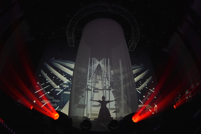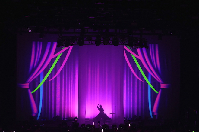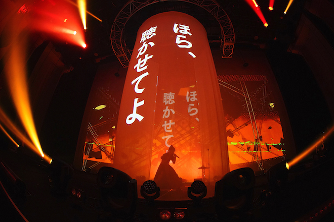 オープニングがはじまると、ステージの幕が上がり、会場の中央に大きな筒状のカーテンが登場しその中から吉乃が姿を現すと、会場中から大きな歓声が巻き起こった。程なくして会場は、吉乃の“生の歌声”“生のパフォーマンス”に驚愕する。