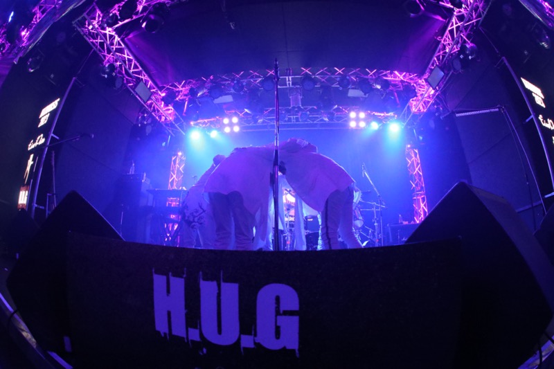 H.U.G、メリーのステージを観ていたHirofumiは、当時のノスタルジックな記憶が甦ったようで、「<KATHARSIS>っていうのは随分前に地元の大阪で俺らが主催してやってたイベントなんですけど、今以上に黒塗りの人たちがいっぱい出てすごい激しくて。ノリノリの会場の中、俺らがスンって出て行って(笑)、すごい遅いテンポでなんとか踏ん張ってやってたイベントなんですけど、今日もなんとか踏ん張って最後までやるんで、楽しみにしててください」と語った。