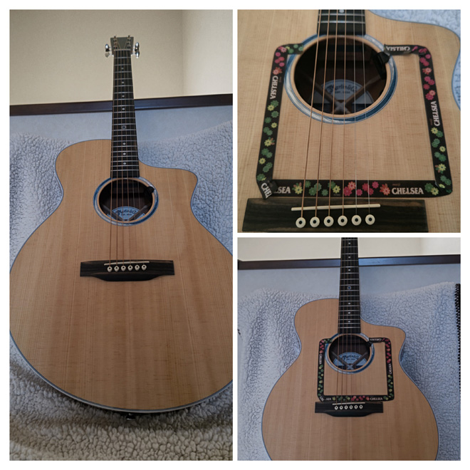 PickupをFISHMANのPowerTap Infinityに変更していたこともあり、これ幸いとピックガードからゴルペ板に変更しました。ゴルペ板がclearなのでチェルシーのマスキングテープで目印しました。修理は大変だった様で苦労をかけました。出来上がりに満足しています。