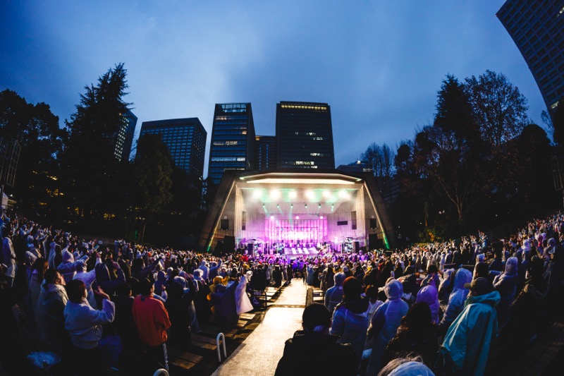 アンコールで披露されたのは「銀河鉄道の夜」と、同じ世界線にある「廃線された未来駅にて」。夜空の下で聴くこの2曲は格別だ。晴れた星空だったらもっと気持ちが良かったのかもしれないが、小雨が降る中で聴くというのも貴重な体験だったと思う。青いサーチライトが会場を照らす「廃線された未来駅にて」での、スコンと抜けるササブチのドラムが心地良い。エンディングでは石井のスキャットに合わせてクラップが沸き上がり、一体感を作り上げた。