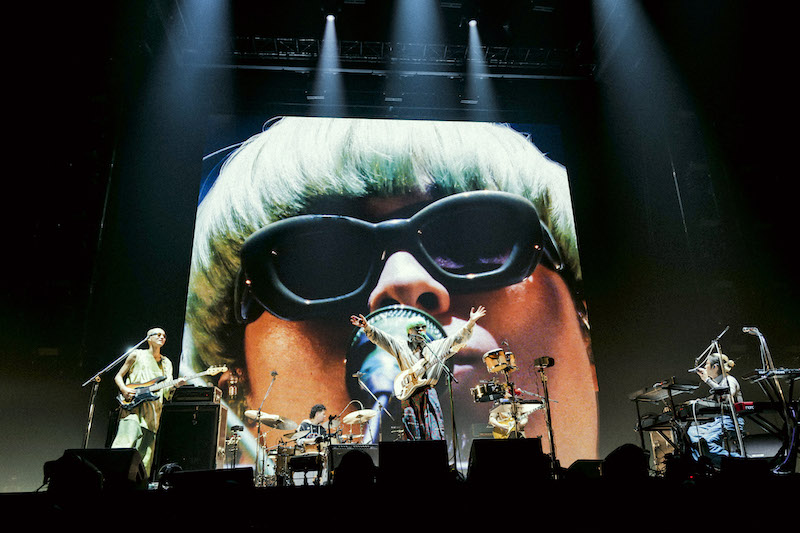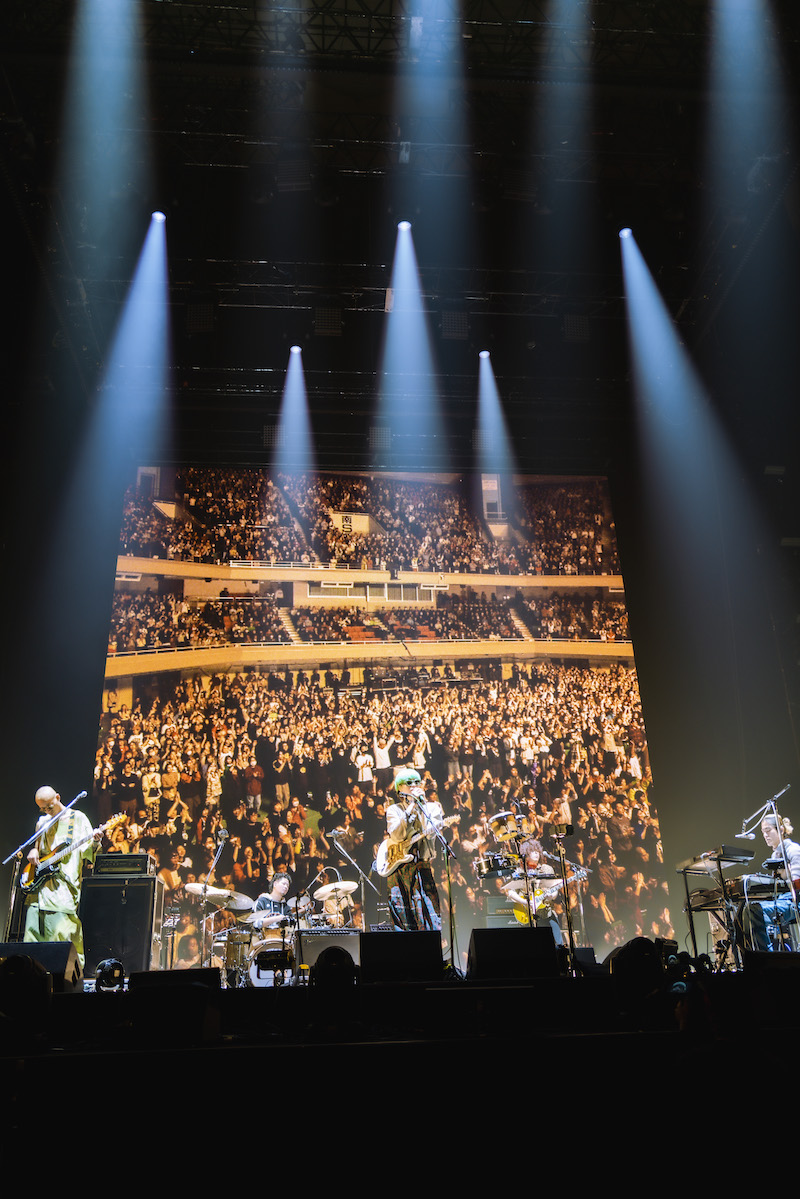 個人的に、Kroiの凄さはこの「カジュアルさ」にあると思っている。「夜明け」の歌詞、“もうじき朝が来る 正直一睡もしてない”というフレーズは、まるで武道館に臨む彼らの心境を表しているようではないか。さらに後ろのスクリーンに映されたビジュアルでは、朝日が昇ってゆく様子が表現されており、個人的にはこれを彼らなりのギャグとして解釈した。実際、その後のMCでUchidaは武道館公演を前にした「浮足立ちエピソード」として「(普段は買わない)タピオカ購入」を挙げ、Yuki Hasebe(G)はライブ前に「MONGOL800の過去のライブの模様をPCで確認しながらシミュレーションしていた」と語った。百戦錬磨のテクニックを鼻にかけるでもなく、彼らからすればその技巧は喫茶店の雑談のようなものなのかもしれない。