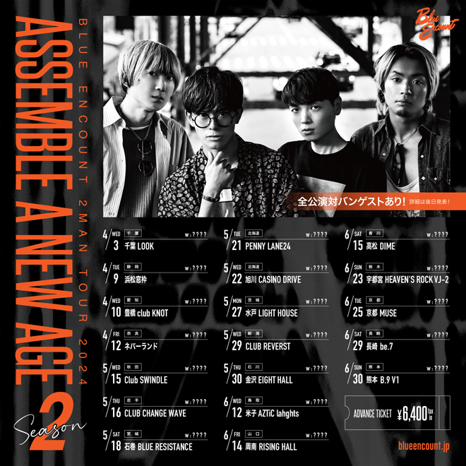 早速発表されたお知らせでは、2024年ライブツアー<BLUE ENCOUNT 2MAN TOUR 2024 “ASSEMBLE A NEW AGE -season2-”>の開催が発表。昨年7年ぶりに行われた2MANライブツアーが早くも復活、これまであまり訪れることができていなかった地方も含めた全国19箇所を回り、10周年記念にふさわしい“感謝を伝えるツアー”だ。各公演のゲスト対バンは、同世代はもちろん、より若い世代や後輩たちも迎えるとのこと。今後の発表を楽しみにしよう。