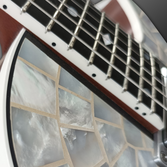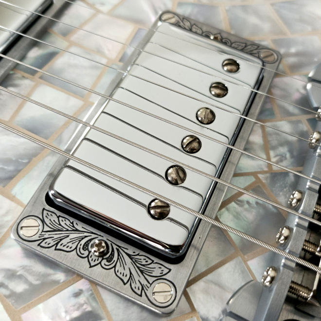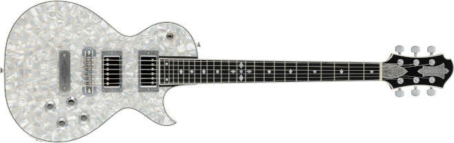 ボディー・バックに厳選されたホンジュラス・マホガニーを採用し、ボディー・トップにストレート・カット・スタイルのマザー・オブ・パールを使用したゼマイティスならではの華やかで品のあるモデル。伐採から50年以上寝かせてシーズニングさせた特別なホンジュラス・マホガニーを使用したネック、櫃の高いエボニー・フィンガーボードといったウッド・マテリアルにゼマイティス・オリジナルのアルミ合金を使用したブリッジ&テイルピースやピックアップ・リングを組み合わせることで、脈々と続くゼマイティスの2ハムバッカー・パール・フロント特有のトーンを継承している。635mmのスケールを採用し、ミディアム・サイズの24フレット仕様になっている。