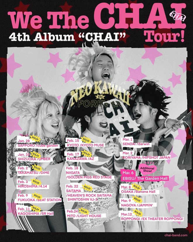 1月に活動終了を発表したCHAIが、現在開催中のラストツアー<We The CHAI Tour!>の追加公演を3月6日(水)東京・恵比寿ザ・ガーデンホールで行うことが決定した。