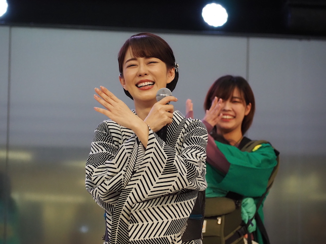 「色々な曲があるのですが、外は寒いけど会場は温かくなりたいので、“みどり”と掛け声を入れてもらえる曲を選びました」と、2曲目は「伊那のふる里」で観客と一緒に盛り上がった。「最近は『千鳥の鬼レンチャン頑張っているね!』と、声を掛けてもらえるのですが、かまいたちの山内さんに言われっぱなしならないように頑張ります」と、会場を沸かせ、「涙唄」のカップリング曲「阿武隈・恋慕情」を熱唱。