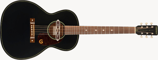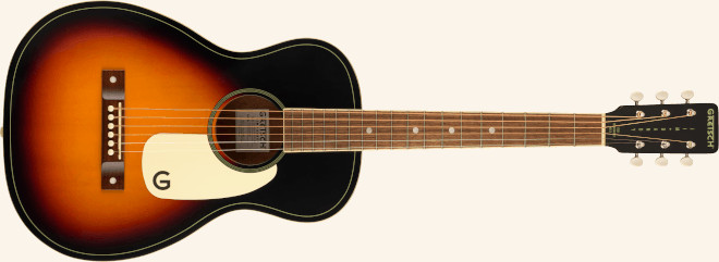 小柄でポータビリティに優れたパーラーボディと24インチスケールの「Jim Dandy Deltoluxe Parlor」は、パーラーギターならではの明瞭で独特なミッドレンジトーンが魅力。Xブレーシングを施したボディには厳選された軽量ラミネート材を使用し、ウッディなヴィンテージトーンと耐久性を最適なバランスで実現。“C”シェイプのネックは、長年愛用してきた楽器のような優れた演奏性。Gretsch Deltoluxeマグネティックサウンドホールピックアップは、ライブパフォーマンスやレコーディングなどの現場で多用途なアコースティックトーンを生み出し、エフェクトペダルとの相性も抜群。ヴィンテージスタイルのピンブリッジ、“G”グラフィック入りピックガード、ペイントされたピンストライプパーフリング、“3-on-a-plate”オープンギアチューニングマシン、オーバーサイズドットインレイなど、当時の仕様に忠実なディテールがノスタルジックな個性を醸し出す。「Jim Dandy Deltoluxe Parlor」は、初心者からベテランまで、自宅やカフェなど、あらゆるシーンとプレイヤーに応えるギター。カラーはBlack Top。