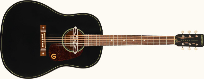 特別に設計されたスロープショルダーボディと24.75インチスケールの本製品は、ドレッドノートギターの特徴である音量感やローエンドのレスポンスを犠牲にすることなく、快適でコンパクトなデザインにまとめ上げられている。Xブレーシングを施したボディには厳選された軽量ラミネート材を使用し、ウッディなヴィンテージトーンと耐久性を最適なバランスで実現。“C”シェイプのネックは、長年愛用してきた楽器のような優れた演奏性を提供。Gretsch Deltoluxeマグネティックサウンドホールピックアップは、ライブパフォーマンスやレコーディングなどの現場で多用途なアコースティックトーンを生み出し、エフェクトペダルとの相性も抜群。ヴィンテージスタイルのピンブリッジ、べっ甲柄“G”グラフィック入りピックガード、ペイントされたピンストライプパーフリング、“3-on-a-plate”オープンギアチューニングマシン、オーバーサイズドットインレイなど、当時の仕様に忠実なディテールがノスタルジックな個性を醸し出す。「Jim Dandy Deltoluxe Dreadnought」は、初心者からベテランまで、自宅やカフェなど、あらゆるシーンとプレイヤーに応えるギター。カラーは、Black Top。