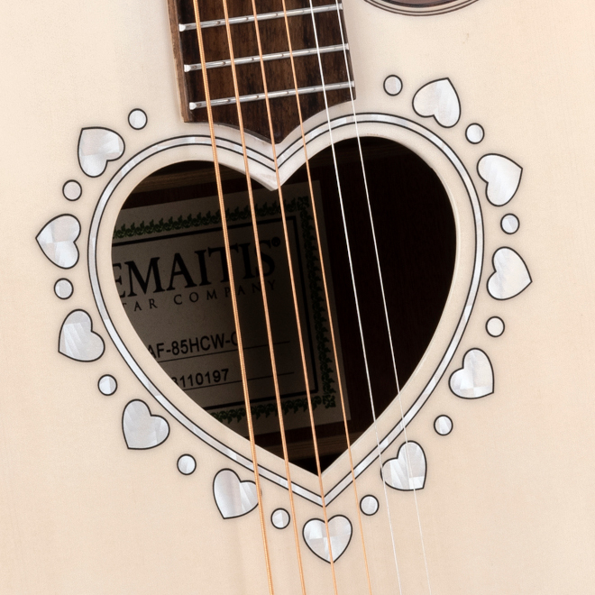 マザー・オブ・パールのダイヤモンド・インレイが輝く特徴的なヘッドストックを持ったネックはマホガニー、フィンガーボードにはローレルを採用した20フレット仕様の14フレット・ジョイント。ゼマイティスの伝統的なハート型のサウンドホールの周りに特徴的なハートをちりばめたデザインとマスターシュ・ブリッジのオリジナル・デザインは特徴的。トップ・ブレイシングは、サウンドホールの形状やボディーのサイズを考慮して、最大限の鳴りを引き出すためにフォワードXブレイシングを採用。また、最大の特長として、ボディ・トップは板材の時に真空状態で熱を加えることで余分な水分やミネラルを取り除いたソリッド・スプルースを使用し、サイドとバックにはサペリを採用し、狂いの出にくい安定したボディ剛