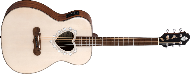 ボディー・サイドには4バンドEQとクロマティック・チューナー機能を持ったプリアンプを搭載し、お好みのトーンでアンプなどの外部機器にも出力できる。トップ・カラーは木地着色を行うことで木目を消すことなく素朴な仕上がりを目指したアンティーク・フィニッシュのホワイト。