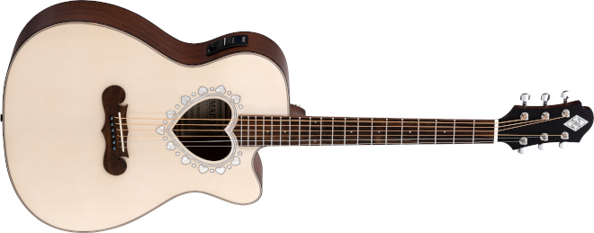 CAF-85H-Cは、ハート・サウンドホールを有するオーケストラ・モデル、CAF-85HCW-Cはそのカッタウェイ・タイプで、マザー・オブ・パール柄のロゼッタを採用し、アンティーク・フィニッシュのオフホワイトのボディー・トップとの白を基調とした組み合わせは、chayらしいセレクトで、柔らかな印象だ。