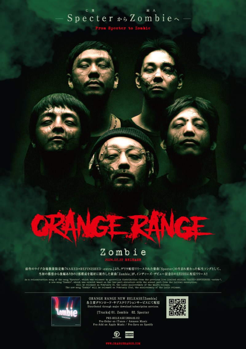 ORANGE RANGEがインディーズデビュー記念日の2月22日、配信シングル『Zombie』をデジタルリリースする。これに先駆けて、新曲「Zombie」のモーションアートワークのショート動画がオフィシャルYouTubeチャンネルに公開となった。
