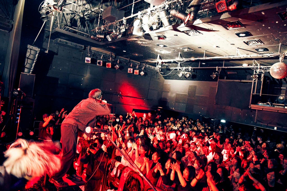 「アゲていくぞ!」と片桐が声を上げ、バンドの演奏は一気にヒートアップ。UKガレージロックを思わせる演奏にシネフィルである片桐のフェイバリットムービーのタイトルを歌詞として幾つも載せた「【Lenny code fiction】」、バンドが一丸となって突き進む狂乱のロックンロール「Alabama」、そしてタフでファンキーなロックナンバー「TOKYO」とノンストップで繋げ、フロアを揺らしていく。「TOKYO」をこの日、セトリに組み込んだ理由はすでに書いた通りだが、早口で言葉をたたみかけ、観客を煽る片桐の背後ではソラ、Kazu、KANDAIが笑顔でアイコンタクトを取っている。