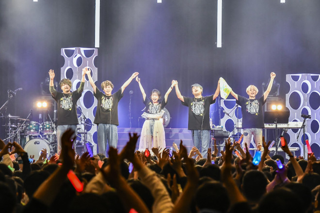 「さあ、ここからもたたみかけていきたいと思います! 東山の“ハッピーセット”、いきますよー!」という掛け声とともに、怒涛の終盤へ。咲き誇る未来を予感させるロックチューン「FLOWER」に、軽快に刻むギターやうねるベース、駆け出すドラムとキーボードが体を揺らす「ワゴン」。「ANIMAX MUSIX 2023」などでも歌われ、ソロのライブではようやくの初声出しとなった「グー」は、真っ赤なペンライトに染まるフロア、速いテンポでのコール&レスポンスと、まさにお祭り騒ぎとなった。
