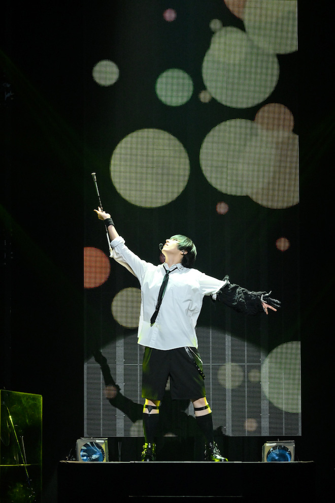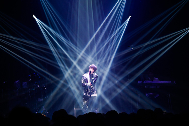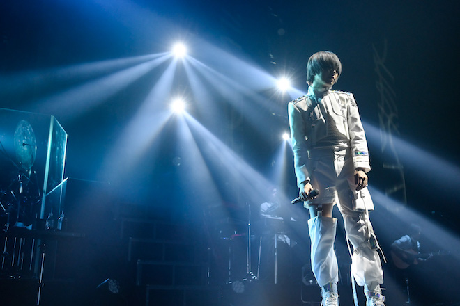 アコースティックギターによるアレンジバージョンで演奏された「Key to My Heart」でしっとりと歌声を響かせた蒼井翔太は一旦ステージ袖へ。バンドメンバーの紹介コーナーを挟んで再び登場した蒼井翔太は、白シャツに黒いネクタイとハーフパンツというスタイリッシュな装いに衣装チェンジ。「BAD END」「PSYCHO:LOGY」「硝子のくつ」とシリアスでエッジの効いたナンバーを続けて披露した。さらにノンストップで世界観を一変させ「Harmony」「Tone」と疾走感のあるポップチューンを歌い上げ、会場を独自の世界観に引き込んでいった。