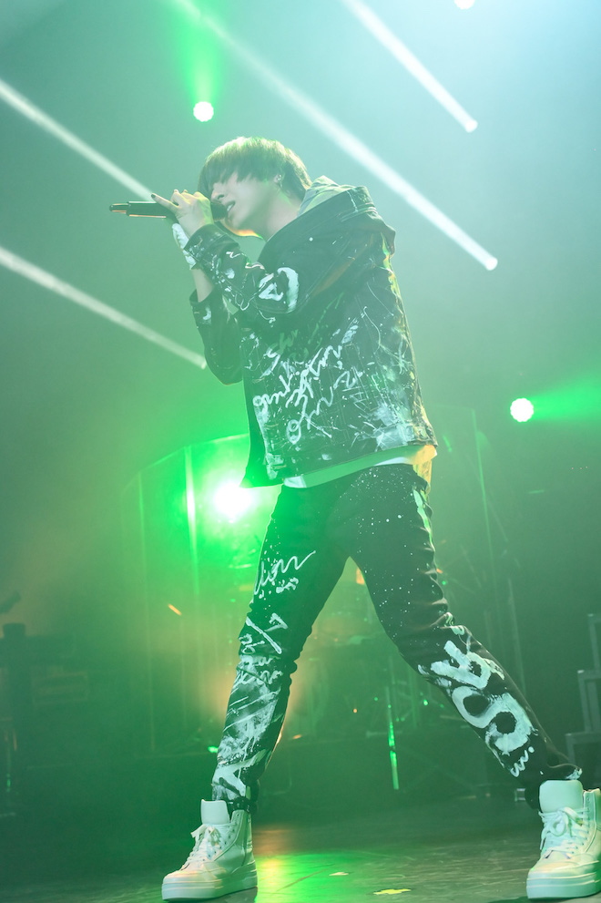 アルバム『DETONATOR』のオープニング曲でもある「Freestyle Lover」のイントロがドラムソロでスタートすると、ベース、キーボード、ギターと徐々に音が加わっていく。音の増幅とともに観客の期待が膨らむ中、デニムのセットアップに白いペインティングが施されたストリート感のある衣装を身に纏った蒼井翔太がステージ中央に登場。会場へ「Let’s Go!」と投げかけると、大きな歓声があがった。“君らしく僕らしく輝け”と背中を押してくれるようなメッセージを熱く歌い上げ、そのまま間髪いれずに息を吸い込み「Eclipse」へ。アウトロで鳥肌が立つほどの圧巻のロングハイトーンを披露し、続く「イノセント」でも重低音が鳴り響くロックチューンを圧倒的な歌唱力で歌い上げた。