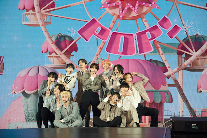 また、田島将吾と髙塚大夢が作詞に参加した「Dirty Shoes Swag」では、曲名に因んでスニーカーを吊るしたサイクルに乗り登場。外周を周りながら客席に向けて手を振るなど、近距離で観客に笑顔を届けるシーンも。その後はアイランドステージと呼ばれる、後ろ側のスタンド席に近いステージに降り立ちファンを盛り上げ、「INItialize」「New Day」やヒット曲「FANFARE」とアップテンポの曲で畳みかけ、ボルテージは最高潮のまま本編の幕を閉じた。