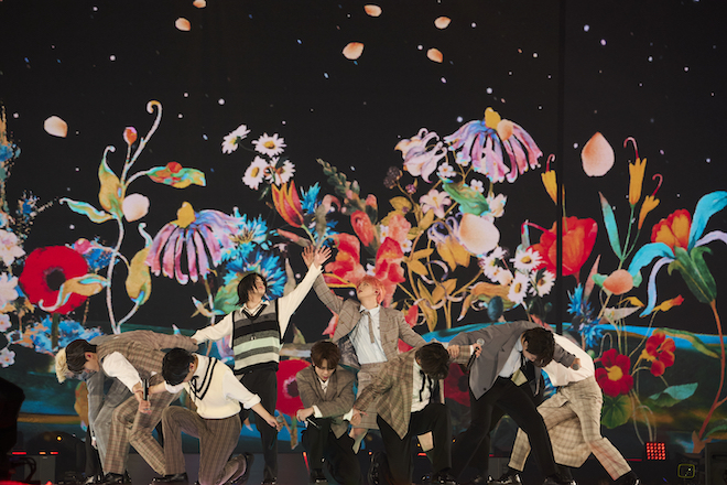 その後、「Runaway」「STRIDE」では観客全員と合唱する場面や、しっとりとハーモニーを奏でる「Mirror」を歌い上げると会場からは拍手が沸き起こり、一体感が増していく。5thシングルのタイトル曲「HANA_花」では、ステージの大きな LEDだけでなくメンバーが立つセンターステージの足元にも花が映し出され、まるで花畑の中で歌っているかのようなステージに。