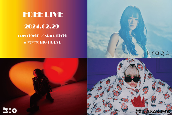 krage、ざきのすけ。、紫 今というネクストブレイクが期待される3アーティストによるフリーライブが、今日2月29日(木)に東京・BIG HOUSE(六本木)にて開催される。