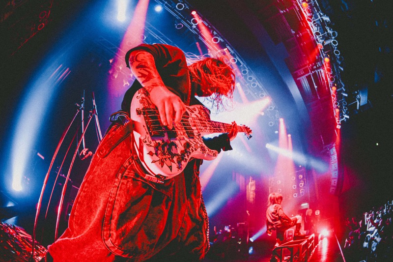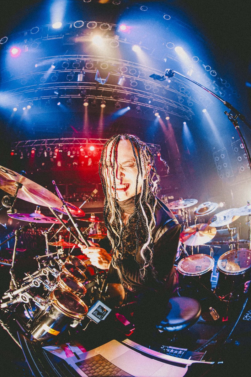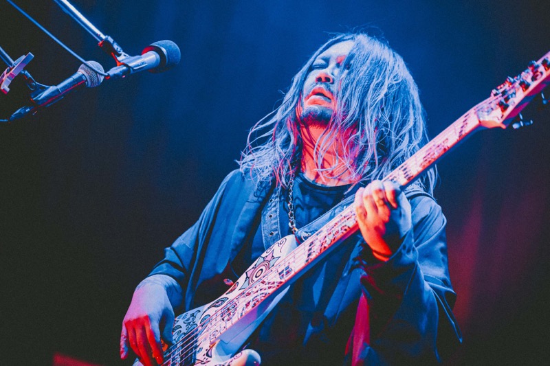 ステージが真っ赤に照らし出されると、ドクドクと脈打つようなイントロから「君の脊髄が踊る頃に」へ。激しいサウンドと解放感のあるメロディでフロアの熱量はどんどん上がっていく。滑り出しから十分な盛り上がりに見えたが、曲中にSORAが「もっと!」と言わんばかりに自分の胸を拳で殴って見せ、千秋も「そんなもんちゃうやろ! 近づいてこい!」と焚きつける。「包丁の正しい使い方〜実行編〜」の怪しいイントロでは歓喜の声があちこちで上がり、さらにヒートアップ。ヘッドバンギングの嵐の中、青い光に照らされるメンバーの狂気が滲む表情にゾクゾクさせられる。