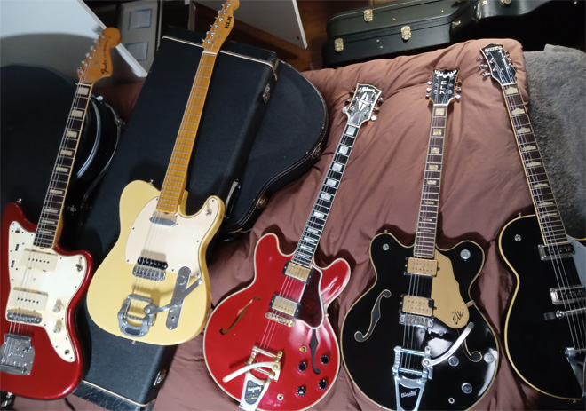 話を振るだけ振って答はお預けというイケズなお方。いやいや分からんて。でも全国のギター好き好きマンにとって、こういう妄想話は嫌いじゃないですよね(笑)。えとね、まず唯一ビグスビーが乗っていないのがジャズマスターなので、それが第1位:3.4kg。で、やっぱりソリッドということで同列最重量4.4kgギターの1本はテレタイプで決定。エルクってのがちょっと引っかるけど…妙に軽いヤツ、あったりするからなあ。で、順当に行くと最重量のもう一本はソリッドのグレッチなんだけど、これは完全ソリッドじゃないかもしれんことを考えるとさほど重くないということで、第3位:3.7kg。であれば一番重いのは335。センターブロックずっしり。エルクのセミアコはビグスビーがなければアコギのように軽いと妄想。ということで軽い順結果発表。第1位:ジャズマスター、第2位:エルクセミアコ、第3位:グレッチ、同列第4位:テレタイプ、335。皆さんの見解は?(JMN統括編集長 烏丸)