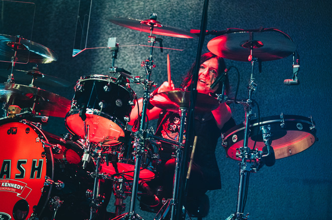 MELT 4による30分間の熱演を経て、ふたたび場内が暗転したのは午後7時25分のこと。オープニングSEが流れる中、メンバーたちが薄暗いステージ上で配置に就くなか、ひと目でスラッシュだとわかるシルエットが見えただけで歓声が高まりをみせる。その瞬間からアンコールに至るまで、この夜の総演奏曲数は22曲。当然ながら今回の来日公演は2022年に発表されたこのバンド名義での現時点での最新作『4』に伴うツアーの一環としてのものであり、そのうち7曲をこの作品からの楽曲が占めていた。ステージの背景を覆う巨大なバックドロップも同作のアートワークと共通するものだ。