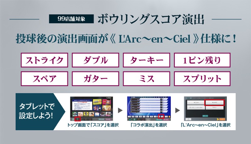 ▲ボウリング投球後の演出映像、L’Arc-en-Ciel専用デザインのラウンドワンオリジナルプリント機(Rism)
