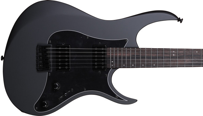 「Diablo Black Friday 2023 Select」のギター。ボディーはマホガニーを使用し、エルボー・カットやバック・カット、ストレスのないハイフレットへのアクセスを可能にしたヒール・カット、バック側カッタウェイのスクープ・カットを採用し、演奏性の高いデザイン。フィンガーボードはエボニー、ネックはローステッド・メイプルの組み合わせで、プレート・レスの4点留めボルト-オン方式でボディーにジョイント。マシンヘッドは3:3でレイアウトしており、ヘッドは先端に向かって細くなり攻撃的な印象の尖ったシェイプをしている。パーロイド・ドットのポジション・マークは12フレットまでを6弦側、以降24フレットまでを1弦側に配置。フレットには硬質なステンレスを採用し、ネック調整を行うアジャスタブル・トラスロッドはヘッド側に備えている。ピックアップはブラック・メタル・カバーの「Hypernova(ハイパーノヴァ)」ハムバッカー2基をマウントし、ヴォリューム、プッシュ-プル・コイルタップ・スイッチを兼ねたトーン、3ウェイ・ピックアップ・セレクター・スイッチを装備。セラミック・マグネットを使用したHypernovaハムバッカーは、アグレッシヴでありながらタイトな低音域のレスポンスと素早いアタックで、大出力かつ明瞭なサウンドを実現。激しい演奏でもチューニングの安定性が高いロッキング・チューナー、オリジナル・フィックスド・ブリッジを搭載。ハードウェアはブラックで統一し、ボディー・カラーはサテン・ブラック。