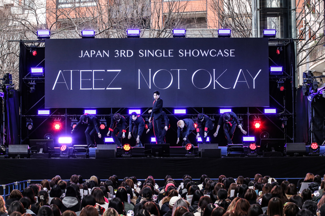 韓国の8人組ボーイズグループATEEZが、2月28日にリリースされたJAPAN 3RD SINGLE「NOT OKAY」の発売を記念して、ATEEZ JAPAN 3RD SINGLE「NOT OKAY」SHOWCASEを2月29日、六本木ヒルズアリーナで開催した。本作はユニバーサルミュージック移籍後初のリリースであり、前作「Limitless」以来、約1年ぶりとなる待望の日本オリジナルシングル。それだけにこの日、あいにくの曇り空の下、屋外特設会場を埋めたATINY(エイティニー:ファンの呼称)たちはATEEZの登場を今か今かと待ちわびていた。