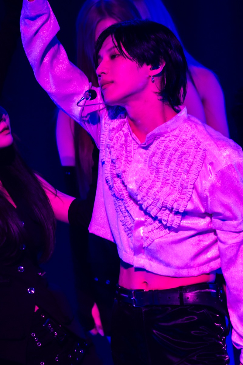 その後、表情を隠すかのように目深にかぶっていたキャップを取り、鋭いまなざしを観客に向けて、2曲目「Advice」へ。ここからはTAEMINの真骨頂でもあるハイレベルなダンスで魅せていく。回転ステージを降りると、ダンサーを従え、歌詞の言葉を一音ずつ捉えたような細かなステップや、素早いターン、胸の下から腰までの位置が露わになった衣装を活かしたウエーブなど、技術力の高さで圧倒する。3曲目「Black Rose」ではそこへしなやかさも加え、誘惑的な表情も見せる。そして、4曲目「Criminal」では大人の魅力を爆発。両手首を紐で括り、それを口を使って外すという妖艶な雰囲気を作り、ダンスブレイクでは全身でダイナミックさを表現。さらに曲の後半では上着を脱いで鍛え抜かれた上半身を露わにする場面もあり、溢れる色気を存分に発揮した。