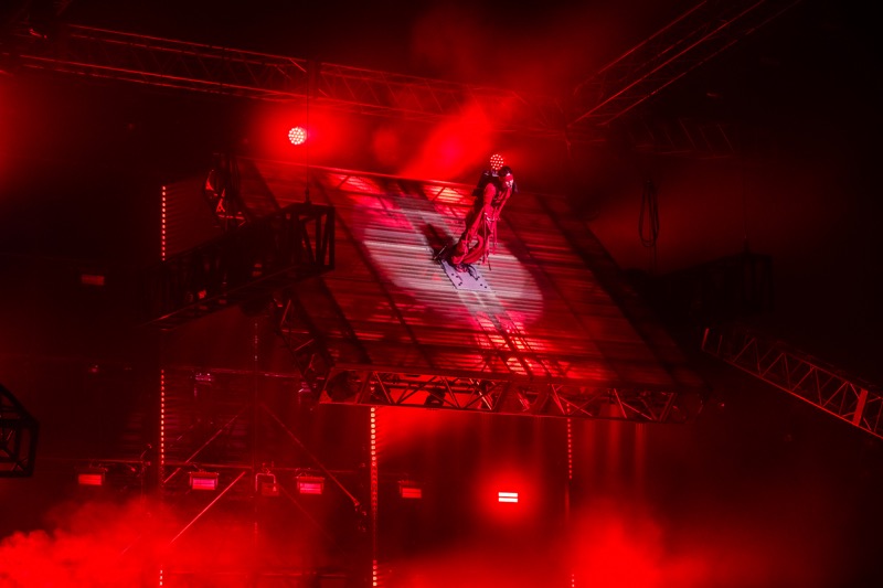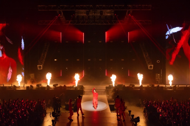 ダンサーのパフォーマンスを挟んで、後半戦がスタート。衣装をここまでのモノクロベースのものから、全身赤のタイトなスタイルのものへと着替え、TAEMINは再び、宙吊りのステージから登場する。今度は逆さまの状態から正位置に戻ってくるという動きで「Door」を日本語で歌い、徐々に客席側に顔が見えてくると、目隠しをしていることがわかる。曲中でステージの回転が止まると、その目隠しをしたまま踊り出すTAEMIN。2017年に行われた自身初のソロライブとなった武道館公演では、四方八方からロープで拘束されまま踊る姿に息をのんだが、今回のバージョンも強烈な印象を刻んだ。