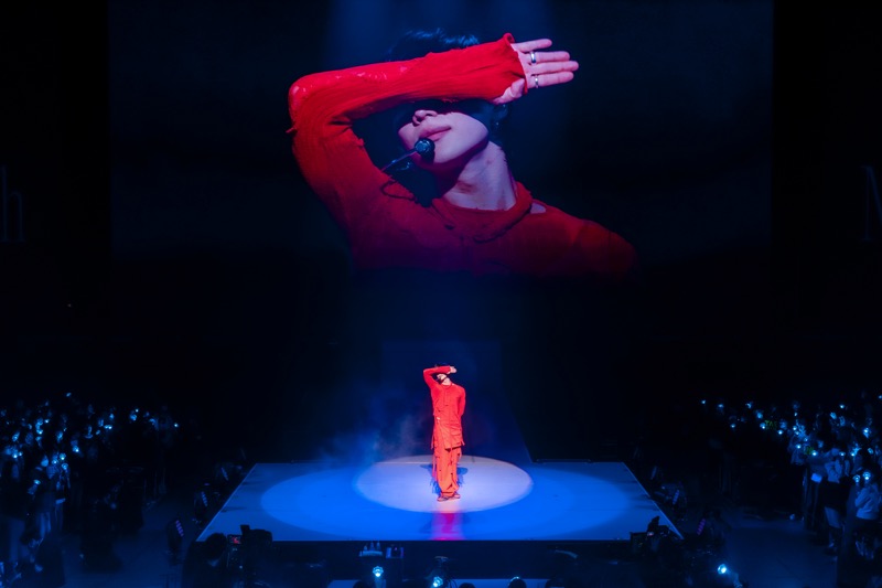 MCを挟んだ前後で披露された『Guilty』からの2曲は、大型ビジョンを使って歌うTAEMINにクローズアップ。「Not Over You」は目を閉じて歌に集中する表情を、「She Loves Me, She Loves Me Not」では、愛が終わっていく瞬間を枯れていく花びらに例えた楽曲を全身で表現する姿を捉えた。