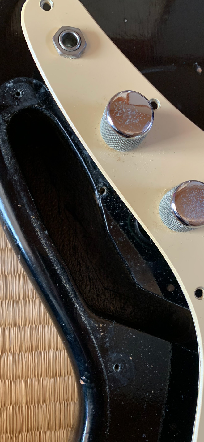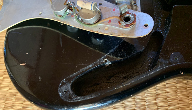 因みに、プラスチックピックガードの物はジャックとトーンとの間にネジがあってボディ内の加工はネジが止まるように膨れる形で削ってあるようです。しかし、黒色のボディの下に塗られてある色は1960年以降のデザートサンドでした。