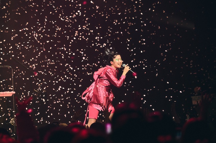 アイマスクを颯爽と投げ捨てたマナが「Hi, everybody!! We’re CHAI. It’s a show time!」と叫んで、Mndsgnをフィーチャーして制作された「IN PINK (feat. Mndsgn)」へ。ユウキが奏でるシンセから放たれるブリブリのベースラインと、ユナが刻むタイトなビートが最高にクール。アウトロではカナがジューシーなギターを響かせ、そこから「ラブじゃん」「アイム・ミー」、そしてユニークな“物販紹介ソング”を挟んでの「Sound & Stomach」と、時にハートフルに、時にキュートに、バンドサウンドならではの有機的な開放感と幸福なカタルシスを生み出すセクションへと入っていく。
