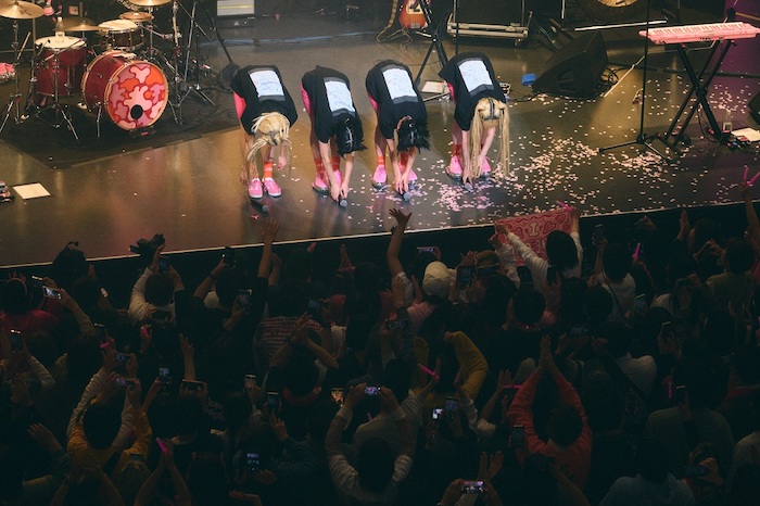 その後しばし、ユナのドラムの上でマナとユウキがサンプラーセッションを繰り広げた後、カナがスタンドマイクを2本持ってステージ中央に登場し、「PING PONG!(feat. YMCK)」へ。ズンズンと腹に来る太いキックに乗ってキラキラとした繊細なメロディを歌いながら、パラパラを踊るマナ&カナ。途中でサラリと、原曲にはなかった、ドナ・サマーの「I feel love」をマッシュアップした展開を差し込んでくるのもアガる。続く「ACTION」では4人ともがハンドマイクを持ち、フォーメーションダンスを披露。それまで彼女達の背中を彩っていたヒラヒラとしたリボンをサッと取り去ると、そこには「新可愛」の3文字が。この絶妙なユーモアセンスも、彼女達のとびきりの魅力だ。