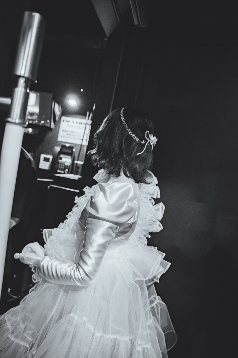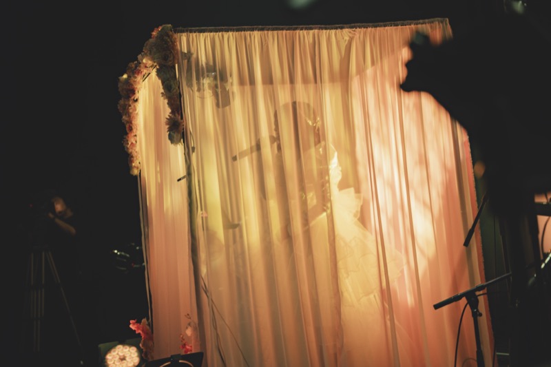 開演時刻となり、スクリーンに映し出されたのは街のあちこちを1人歩いていく、こはならむの後ろ姿。普段は顔を出さずに活動しているだけに「もしかしたら、こうやってどこかですれ違っているのかもしれないな」なんてことを思いながら見ていると、映像は、巡り会えた手と手を繋ぐ瞬間でカットアウトされた。一瞬の暗転。下手からフリルたっぷりのドレスに身を包んだ人影が現れ、ステージ中央に配置された紗幕の小部屋へと滑り込んだ。