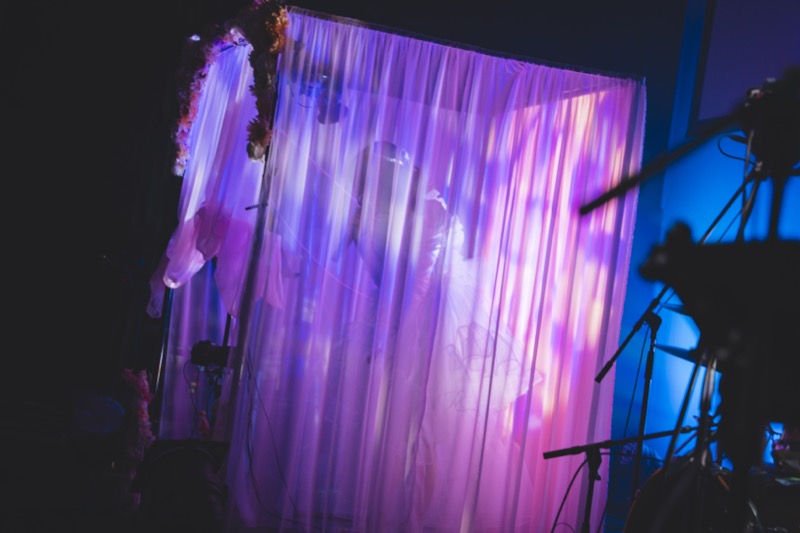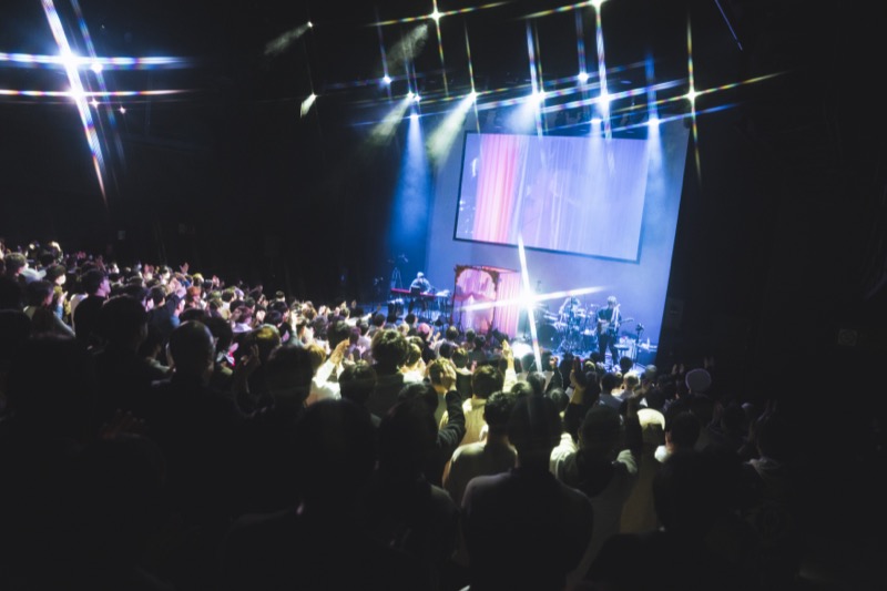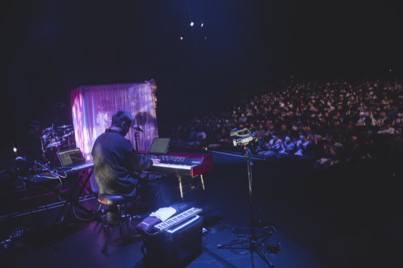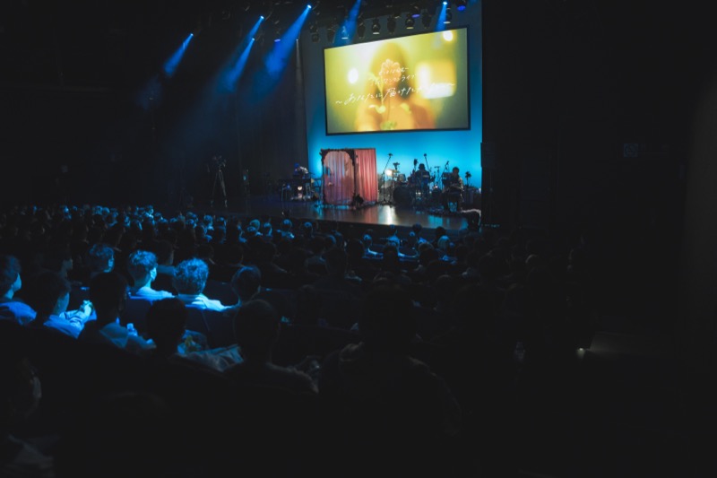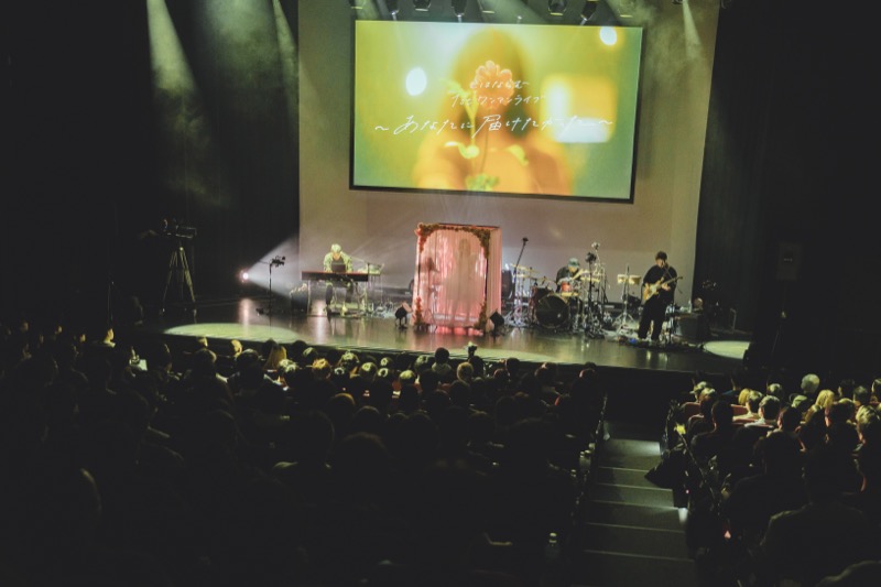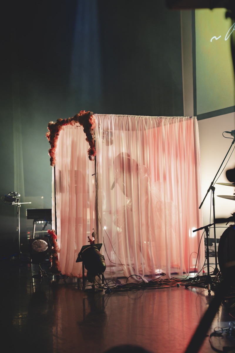 1曲目「不完全花」からスタートしたこの日のライブ。キーボード、ドラム、ギターという3ピースのバンドと共に、こはならむは紗幕に包まれたまま歌い始めた。ステージ後方からのライトに照らされているため表情は見えないが、歌詞に込めた思いを全身で伝えようとするエネルギーは間違いなく客席に届いていた。