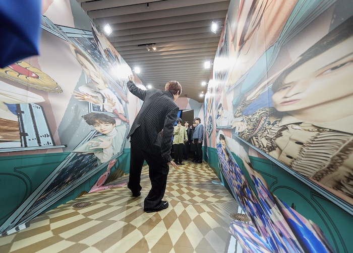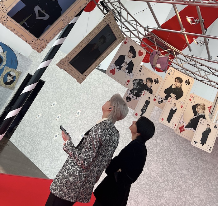 この展覧会はJO1と生み出した不思議な体験型空間。7つに分かれた各エリアでは、メンバーがトランプになって飾られたメリーゴーランドや、トリックアートになったフォトスポット、これまでのヒストリーと衣装の展示など、イヤフォンから流れる音楽やボイスメッセージでメンバーと一緒に遊んでいるかのように各展示を楽しめる。