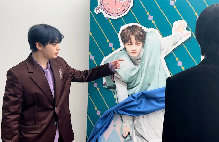 聞きたいと誘われてやってきた豆原と河野純喜は 「雰囲気ぶち壊されてる!」、川尻蓮は「豆原すぎるな〜」と リアクション。奥に進んだコラージュ壁では、鶴房汐恩が自身の顔を指差し「水色のアイラインをしてます」とアピールすると、佐藤景瑚が「メイクかわいいね」と絶賛。ここでは、動きに合わせ効果音が鳴る仕掛けがあり、イヤフォンから流れる曲に合わせて踊り出し、不思議な効果音を楽しむメンバーたち。川西はサインを書いているときにこの効果音に気づき、木全に「ジャンプしてみ」とレクチャー。 ぴょんぴょんと飛び跳ねながら楽しんでいた。