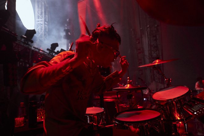 泣きメロチューン「IKAROS」では、放射される照明の美しさと呼応するかのような、まるで天界からの視点のように魂が蕩けていく極上の展開へ。ここで、“WAKE UP”のサンプリング・ボイスがリフレインし、常田が拡声器を片手に会場中を煽りまくる「Slumberland」。勢いそのままに、井口の「まだまだ行こうぜ!」というメッセージとともにポップロック「Sorrows」へと傾れ込んでいく。新井が、ステージ前方で座りながら弾きまくる姿が印象的だった。