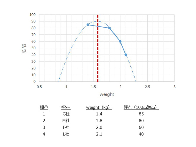 これは面白い分析ですね。そもそも縦軸のプロットが全くの根拠なしというガバガバなものなんですけど、でも個人の感覚を可視化してみてそこから推察を図ってみるというのは、音や音楽のような数値化できない主観的なものに客観性をもたせるには十分かもしれん。もちろんこれは投稿者イチさんのプレイスタイルと価値観でデータ化したものですから、ヘヴィーゲージでガンガンストロークするようなプレイスタイルであれば、J-200とかギルドD-55のようなデカくて重たい個体が高得点となる曲線を描くこともありそうです。重量と音質の相関関係は、ギターやベースにとって永遠のテーマですね。(JMN統括編集長 烏丸)