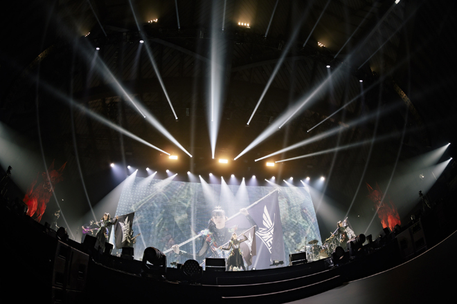 ストーリームービーで語られた、メタルの魂が神の化身に宿った“キツネ43”が象られた巨大な岩からBABYMETALが登場すると、「BABYMETAL DEATH」でライブが幕を上げた。ステージと客席の距離感が近い中で、ステージ上のBABYMETALからは、強い気迫が波のように押し寄せ、会場は一気にライブモードに入った。続く「Distortion (feat. Alissa White-Gluz)」と「PA PA YA!! (feat. F.HERO)」では、炎の演出もあり、会場は更に熱気を帯びた。「Shanti Shanti Shanti」では、SU-METALの歌の節回しも相まってBABYMETALのしなやかで美しいダンスに引き込まれていった。そして、「MAYA」では、一転し、白く輝く巨大LEDをバックに3人のシルエットが浮かび、ヘヴィなサウンドが会場を飲み込んだ。「BxMxC」と「Brand New Day (feat. Tim Henson and Scott LePage)」では、引き続き、LEDに映し出された映像とBABYMETALのパフォーマンスが一体化し、全てが融合した空間を作り上げていた。今回のワールドツアーでは、世界各地のオーディエンスがスマホライトの光で会場を照らしてきたであろう「Monochrome」が披露され、心地よいコールアンドレスポンスの時間が過ぎていった。「メギツネ」でアップテンポに変わると一気にオーディエンスに火が付き、飛び跳ねながらBABYMETALに呼応した。初期曲の「ギミチョコ!!」に突入すると熱い歓声が上がり、会場のボルテージが更に上がっていく。「KARATE」では、重厚な神バンドのプレイが炸裂し、BABYMETALの腕の一振りごとに会場が揺れ、途中、メンバーが倒れて起き上がるシーンでは、BABYMETALのここまでの道のりを回想させられる。オルガンの音とともに、「ヘドバンギャー!!」が始まると、オーディエンスは歓喜し、BABYMETALを労うかのような土下座ヘドバンが続いた。