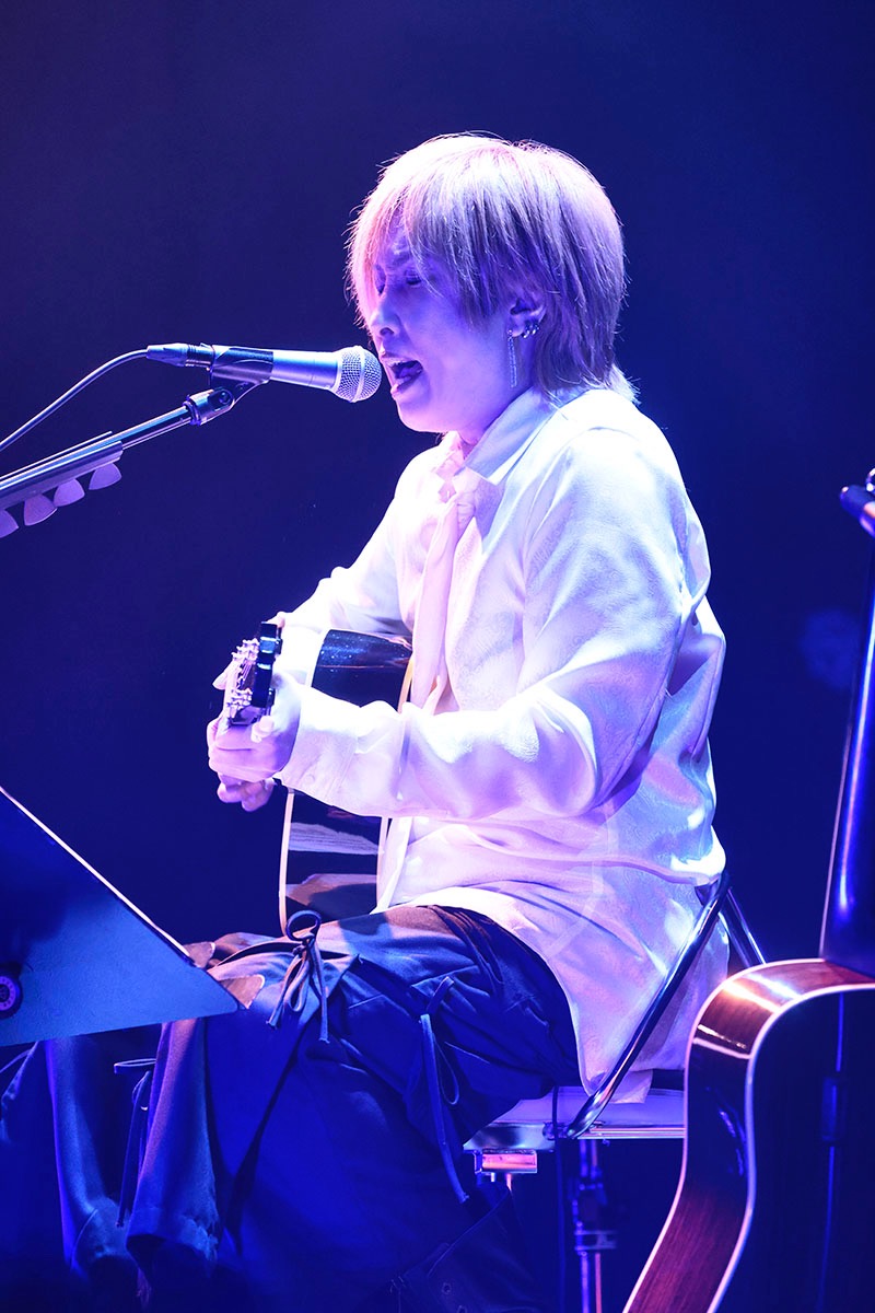 サポートを務めるJOHNとの二人編成で、アコースティックギターと歌のみというシンプルかつ最小限の音数によって、名義を問わずKIRITOの全キャリアから楽曲を披露していくのが、アコースティックシリーズ<Phantom>のスタイルだ。この夜のステージは、KIRITO自身の人生や決意が綴られた「Storyteller」で幕を開け、ラストナンバー「Crave to you」(Angelo)に至るまで、アンコールを含む全17曲が繰り広げられた。