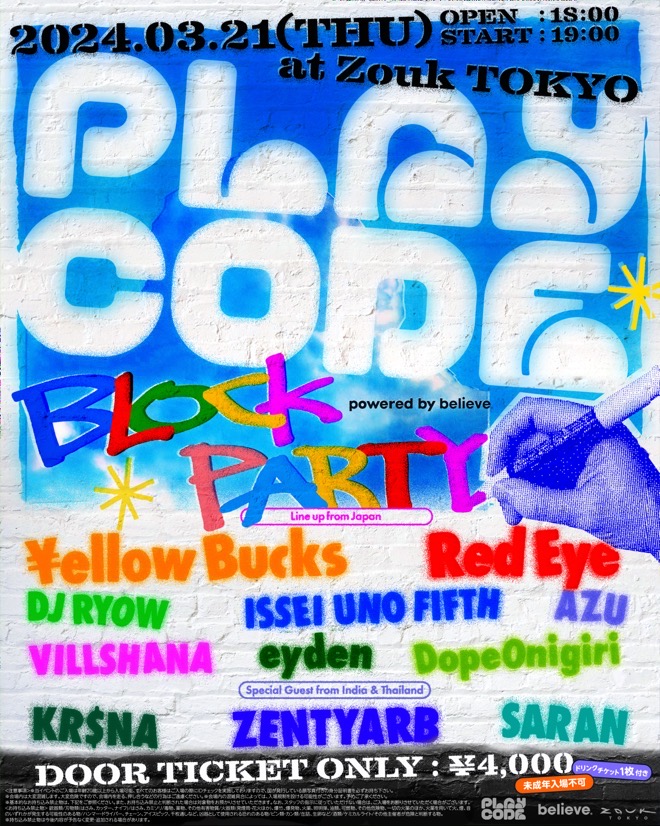 世界50カ国に拠点を持ち130万組以上のインディペンデントのアーティストとレーベルを支援し、世界をリードする大手音楽会社「Believe」の日本法人「Believe Japan合同会社は、日本のヒップホップシーンの成⻑、アーティストの発掘・育成、マーケティングサポートをするため、新しいインプリント*1(音楽ブランド)「PLAYCODE」のローンチを記念し、豪華ヒップホップアーティスト達が登場する発足イベント<PLAYCODE BLOCK PARTY powered by believe>を2024年3月21日(木)、Zouk Tokyoにて開催した。