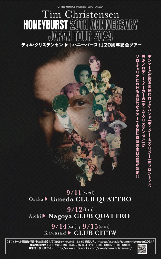 ディジー・ミズ・リジーのフロントマンでもあるティム・クリステンセンが、ソロとして開催する来日公演<HONEYBURST 20TH ANNIVERSARY JAPAN TOUR 2024>が決定した。