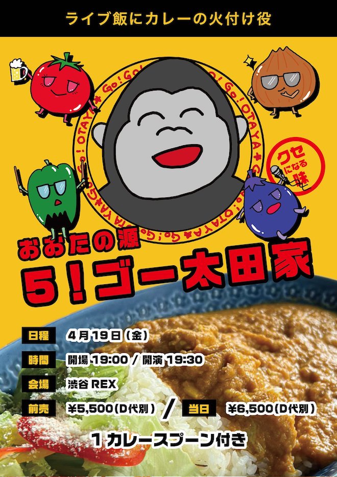 なお、太田家は4月19日に渋谷REXで<5周年記念ワンマンライブ「おおたの源 5!ゴ-太田家>を開催する。渋谷REXは太田家の初ライブ会場でもあり、そこで5周年記念の公演を行うことにもドラマを覚える。この日のチケットにはカレースプーンが付いてくる。さらに会場内ではカレー弁当の販売も行われる。