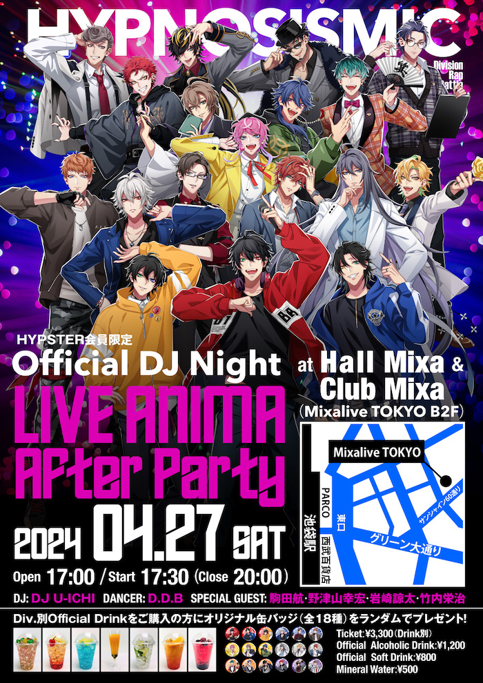 <HYPSTER会員限定 Official DJ Night LIVE ANIMA After Party>と題された本イベントは、4月27日に東京・池袋にあるMixalive TOKYO内Hall MixaとClub Mixaで行われる。今週末開催の<ヒプノシスマイク -Division Rap Battle- 10th LIVE ≪LIVE ANIMA≫>(以下10thライブ)のアフターパーティーという立ち位置だ。